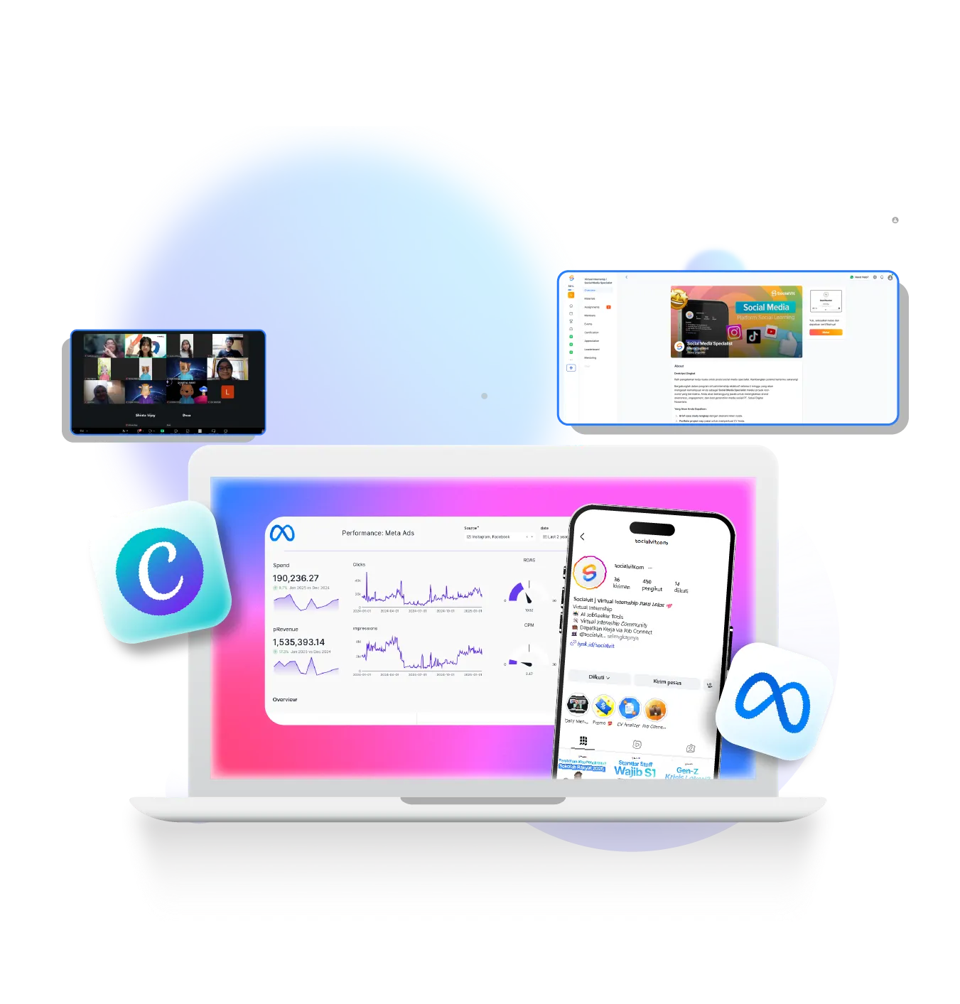 Virtual Internship di SocialVit adalah Komunitas belajar mensimulasikan kerja bareng. Berbeda dengan magang biasa di mana hasil kerjamu hanya dilihat satu perusahaan, di sini Real Project dan Portfolio yang kamu bangun akan dipromosikan langsung ke ratusan Hiring Partner Socialvit. Kamu tidak hanya membangun porto, tapi membangun exposure luas di mata banyak perekrut sekaligus melalui jalur Prioritas Hiring.